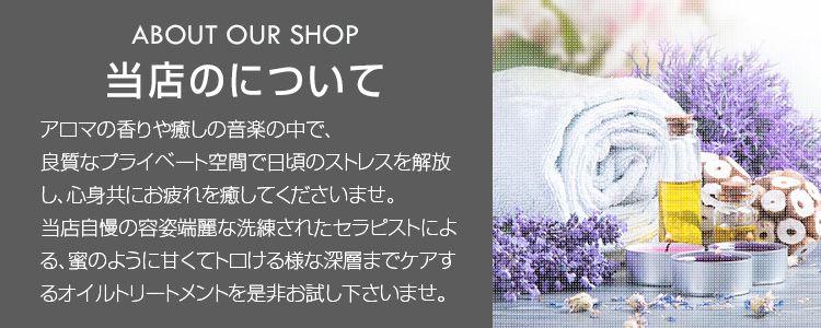 アロマの香りや癒しの音楽の中で、良質なプライベート空間で日頃のストレスを解放し、心身共にお疲れを癒してくださいませ。当店自慢の容姿端麗な洗練されたセラピストによる、蜜のように甘くてトロける様な深層までケアするオイルトリートメントを是非お試し下さいませ。